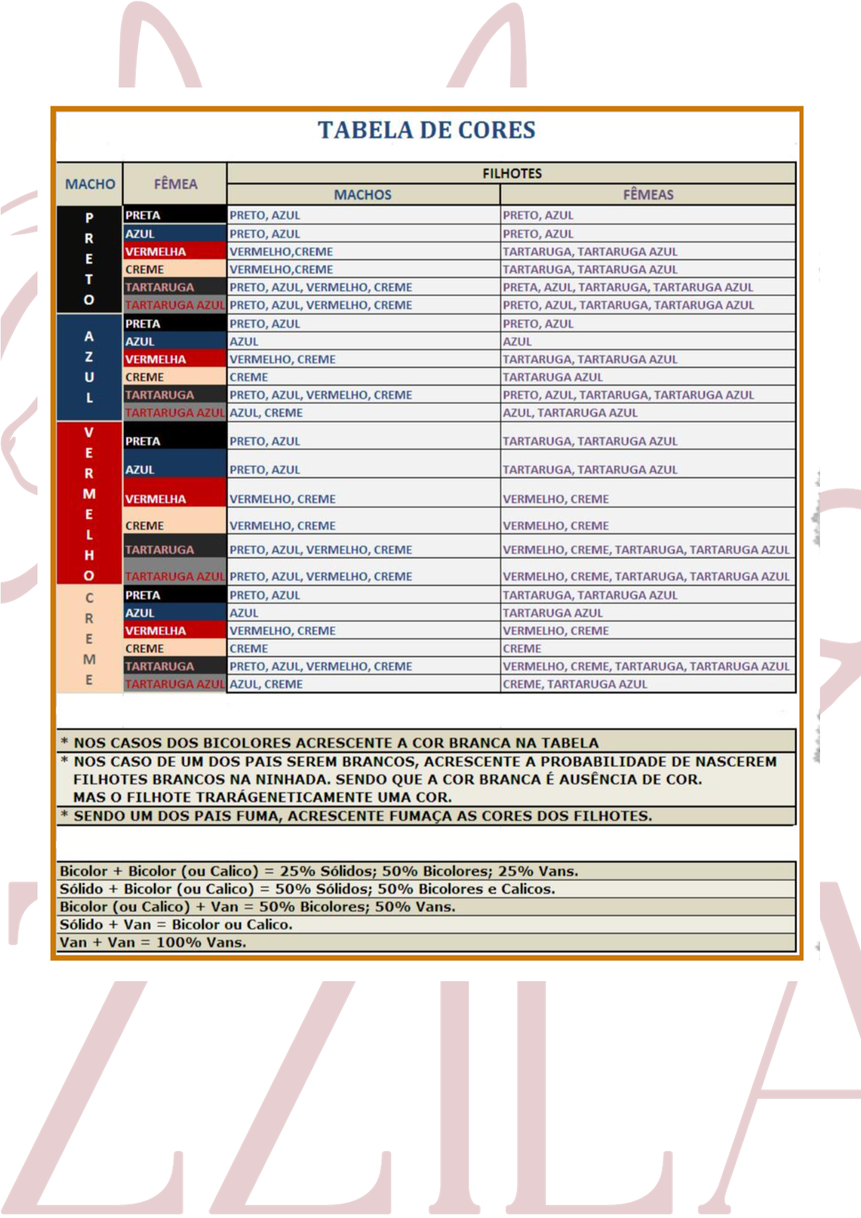 TABELA DE COMBINAÇÃO DE CORES NO CRUZAMENTOS DOS GATOS